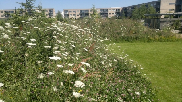 Terasserne er hævet 60-90 cm over terræn og omkrandset af bøgehæk, for at sikre privatlivets fred.